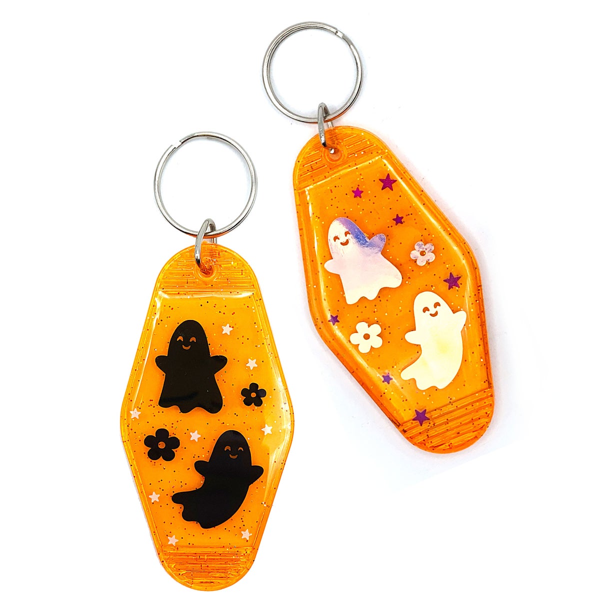 Orange glitter acrylic tag with cute little ghostie graphics and confetti stars.