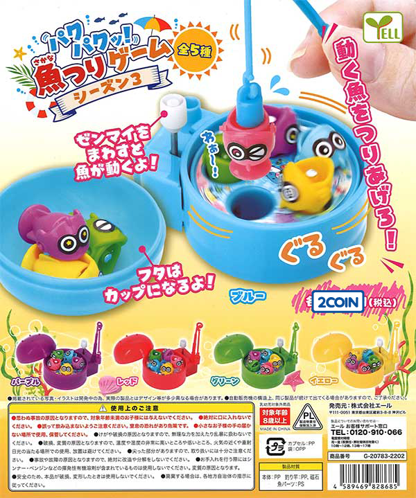 A classic fishing game in the size of a gachapon! There is a crank that will allow the fish to rotate! Each fish has a magnet to fish using the included pole. Very cute!